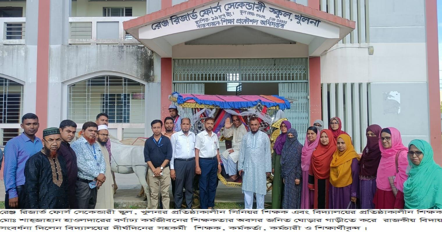 খুলনা রেঞ্জ রিজার্ভ ফোর্স সেকেন্ডারী স্কুলের সিনিয়র শিক্ষক এবং বিদ্যালয় প্রতিষ্ঠাকালীন শিক্ষক মোঃ শাহ্জাহান হাওলদারের অবসর জনিত ঘোড়ার গাড়ীতে করে রাজকীয় বিদায় সংবর্ধনা দিলেন বিদ্যালয়ের দীর্ঘদিনের সহকর্মী শিক্ষক, কর্মকর্তা, কর্মচারী ও শিক্ষার্থীবৃন্দ। দীর্ঘ ৩৬ বছর ৮ মাস শিক্ষকতা জীবনের শেষ দিনটিকে স্মরণীয় করে রাখতে ব্যতিক্রমী এ সংবর্ধনা অনুষ্ঠানের আয়োজন করে রেঞ্জ রিজার্ভ ফোর্স সেকেন্ডারী স্কুল কর্তৃপক্ষ ।