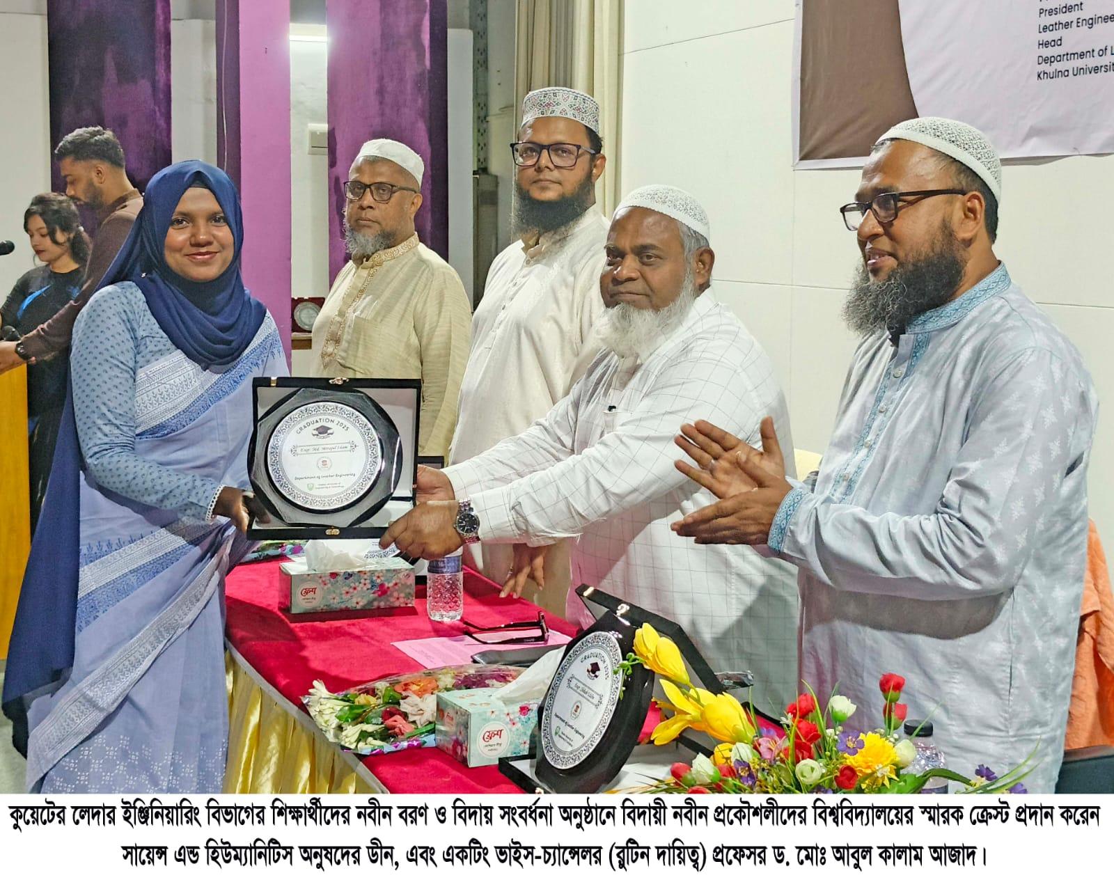 খুলনা প্রকৌশল ও প্রযুক্তি বিশ্ববিদ্যালয় (কুয়েট) এর লেদার ইঞ্জিনিয়ারিং বিভাগের ২০১৯ ব্যাচের শিক্ষার্থীদের বিদায় সংবর্ধনা ও ২০২৩ এবং ২০২৪ ব্যাচের শিক্ষার্থীদের নবীনবরণ অনুষ্ঠিত হয়েছে। লেদার ইঞ্জিনিয়ারিং অ্যাসোসিয়েশন কর্তৃক আয়োজিত অনুষ্ঠানটি ০৩ সেপ্টেম্বর বুধবার বিকালে বিশ্ববিদ্যালয়ের অডিটরিয়ামে অনুষ্ঠিত হয়। অনুষ্ঠানে প্রধান অতিথি হিসেবে উপস্থিত ছিলেন বিশ্ববিদ্যালয়ের সায়েন্স এন্ড হিউম্যানিটিস অনুষদের ডীন এবং একটিং ভাইস-চ্যান্সেলর (রুটিন দায়িত্ব) প্রফেসর ড. মোঃ আবুল কালাম আজাদ। লেদার ইঞ্জিনিয়ারিং বিভাগের বিভাগীয় প্রধান ও লেদার ইঞ্জিনিয়ারিং অ্যাসোসিয়েশনের সভাপতি প্রফেসর মোঃ গোলাম কাদের এর সভাপতিত্বে অনুষ্ঠানে বিশেষ অতিথি হিসেবে উপস্থিত ছিলেন মেকানিক্যাল ইঞ্জিনিয়ারিং অনুষদের ডীন প্রফেসর ড. মোহাম্মদ সুলতান মাহমুদ, পরিচালক (ছাত্র কল্যাণ) প্রফেসর ড. বি. এম. ইকরামুল হক। অনুষ্ঠানে বিদায়ী ও নবীন শিক্ষার্থীসহ বিভিন্ন ব্যাচের শিক্ষার্থীরা বক্তৃতা করে। এসময় অতিথিবৃন্দ নবীন শিক্ষার্থীদের ফুল ও উপহার দিয়ে বরণ করে নেন এবং বিদায়ী নবীন প্রকৌশলীদের বিশ্ববিদ্যালয়ের স্মারক ক্রেস্ট প্রদান করেন। অনুষ্ঠানে লেদার ইঞ্জিনিয়ারিং বিভাগের শিক্ষকমন্ডলী এবং শিক্ষার্থীরা উপস্থিত ছিলেন।।