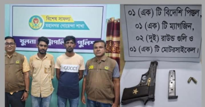 খুলনা মহানগর কেএমপি (ডিবির) অভিযানে বিদেশী পিস্তল ও ২ রাউন্ড গুলি সহ দুই অস্ত্রধারীকে আটক করেছে। আটকৃতরা হলেন পাভেল ও মোটরসাইকেল চালক হাবিব।