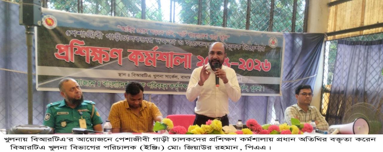 "আইন মেনে সড়কে চলি, স্মার্ট বাংলাদেশ গড়ে তুলি" এই প্রতিপাদ্যকে সামনে রেখে খুলনায় পেশাজীবী গাড়ি চালকদের দক্ষতা ও সচেতনতামূলক রিফ্রেশার প্রশিক্ষণ কর্মশালা অনুষ্ঠিত হয়েছে।বাংলাদেশ সড়ক পরিবহন কর্তৃপক্ষ (বিআরটিএ) খুলনা সার্কেল এর নিজস্ব কার্যালয়ে ৮ অক্টোবর বুধবার সকাল ১০ টায় এই কর্মশালার আয়োজন করে। কর্মশালায় প্রধান অতিথি ছিলেন বিআরটিএ খুলনা বিভাগের পরিচালক (ইঞ্জি:) মো: জিয়াউর রহমান, পিএএ।এসময় উপস্থিত ছিলেন বিআরটিএ খুলনার এক্সিকিউটিভ ম্যাজিস্ট্রেট মেজবাহ উদ্দীন (সি.সহ.সচিব), খুলনা মেডিকেল কলেজের এনাটমি বিভাগের প্রভাষক ডা: অনিন্দ্য কুমার সাহা, বিআরটিএ খুলনা সার্কেলের সহকারী পরিচালক (ইঞ্জি:) উসমান সরওয়ার আলম, মোটরযান পরিদর্শক সাইফুল ইসলাম প্রমুখ।।