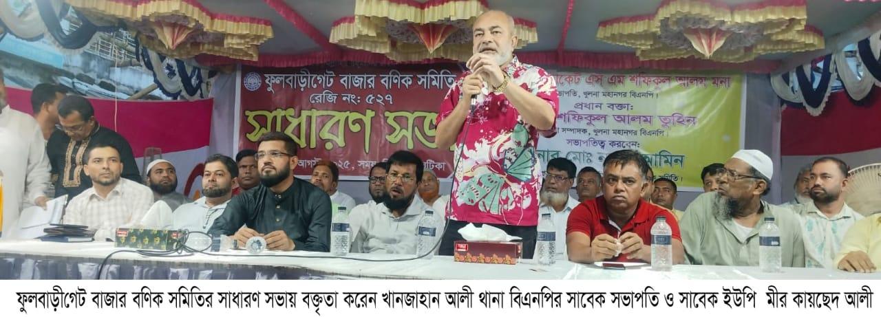 ফুলবাড়ী গেট বাজার বণিক সমিতির সাধারণ সভা ১৮ আগস্ট সোমবার বিকালে ৫ টায় ফুলবাড়ী গেট বাজার চত্বরে অনুষ্ঠিত হয়। আগামী বাজার বণিক সমিতির নির্বাচন উপলক্ষে এ সাধারণ সভার আয়োজন করা হয়। মোঃ নুরুল আমিন এর সভাপতিত্বে এ সময় অতিথি হিসেবে উপস্থিত ছিলেন খান জাহান আলী থানা বিএনপির সাবেক সভাপতি ও সাবেক চেয়ারম্যান মীর কায়ছেদ আলী, খান জাহান আলী থানা বিএনপির সাংগঠনিক সম্পাদক মোল্লা সোহাগ হোসেন, থানা বিএনপি নেতা এনামুল হাসান ডায়মন্ড , আটরা গিলাতলা ইউনিয়ন বিএনপির সভাপতি শেখ আব্দুস সালাম,যোগীপোল ইউনিয়ন বিএনপির সভাপতি আলমগীর হোসেন, যোগীপোল ইউনিয়ন জামায়াত ইসলামের আমীর ইসমাইল হোসেন,কেসিসি ২ নং ওয়ার্ড বিএনপির সভাপতি ইকবাল হোসেন মিজান, মীর শওকত হোসেন হিট্টু, রফিকুল ইসলাম রফিক, জাহাঙ্গীর হোসেন খোকা,মোঃ বেলায়েত হোসেন,মাঈনুল ইসলাম, কাজী শহিদুল ইসলাম,জিয়াদুল ইসলাম, মোঃ বিল্লাল হোসেন। এছাড়া উপস্থিত ছিলেন কাজী নেছারুদ্দীন মন্টু, মোঃ হাফিজুর রহমান , এমদাদুল হক, শফিকুল আলম মুন্সি, মহিবুল হাসান, মোল্লা মুজিবর রহমান, শফিউল্লাহ মিয়াজী, মোঃ হারুন অর রশিদ, মোঃ হুসাইন,বেগ বাবু,রুমি, মামুন মেম্বার, মামুন হোসেন,বারেক হাওলাদার, আজিজুর রহমান আজু। সাধারণ সভার শেষে আগামী ফুলবাড়ী গেট বাজার বণিক সমিতর নির্বাচন পরিচালনা কমিটির চেয়ারম্যান হিসেবে ফুলবাড়িগেট বাজার জামে মসজিদের খতিব মুফতি হাফিজুর রহমান হাফিজ , সদস্য সচিব খান জাহান আলী থানা বিএনপির সাংগঠনিক সম্পাদক মোল্লা সোহাগ হোসেন ও সদস্য কেসিসি ২ নং ওয়ার্ড বিএনপির সভাপতি ইকবাল হোসেন মিজান এর নাম সর্বসম্মতিক্রমে ঘোষণা করা হয়।।