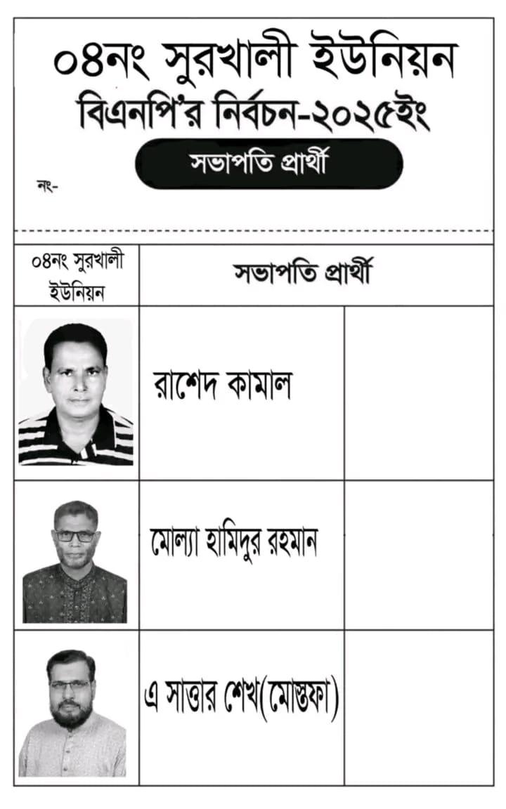 অনেকে টেনে আনছেন সুরখালী ইউনিয়ন পরিষদের চেয়ারম্যান প্রার্থীর ও কথা। কারণ যে সভাপতি বা সম্পাদক নির্বাচিত হবেন, তারাই আগামীর চেয়ারম্যান। এমনটাই ধারণা করছেন ভোটারা। সব মিলিয়ে ভোটার বা অন্য নেতাকর্মীরা সিদ্ধান্ত নিয়ে বসে আছেন কাকে তারা ভোট দেবেন। শহীদ জিয়াউর রহমানের স্বপ্ন এবং আগামীর দেশ নায়ক তারেক রহমানের ৩১ দফা বাস্তবায়নের লক্ষে সব প্রার্থীরা সহযোগিতা কামনা করেন।
