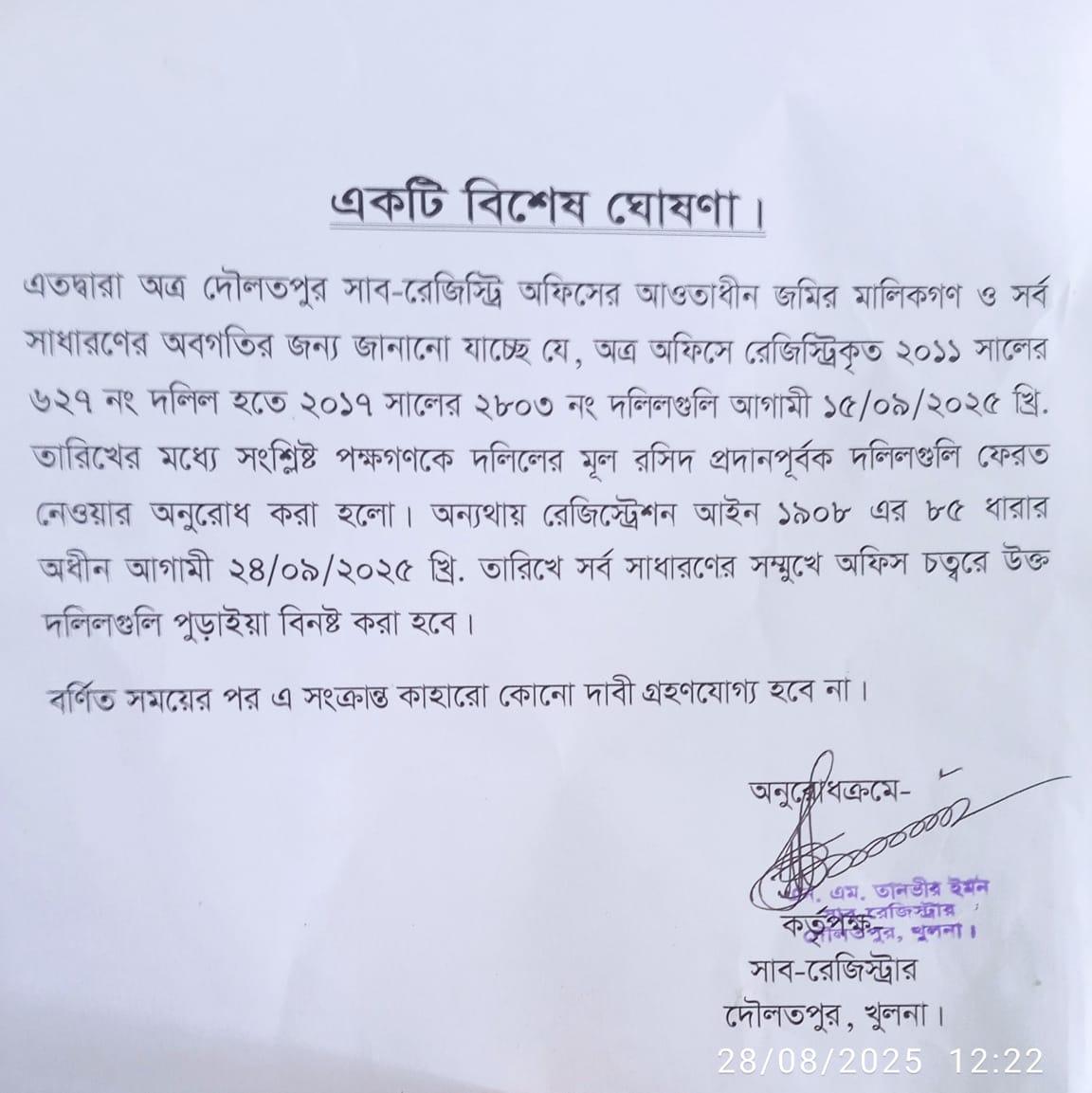 খুলনা মহানগরীর দৌলতপুর সাব-রেজিস্ট্রি কার্যালয়ের বিশেষ বার্তার আদেশ