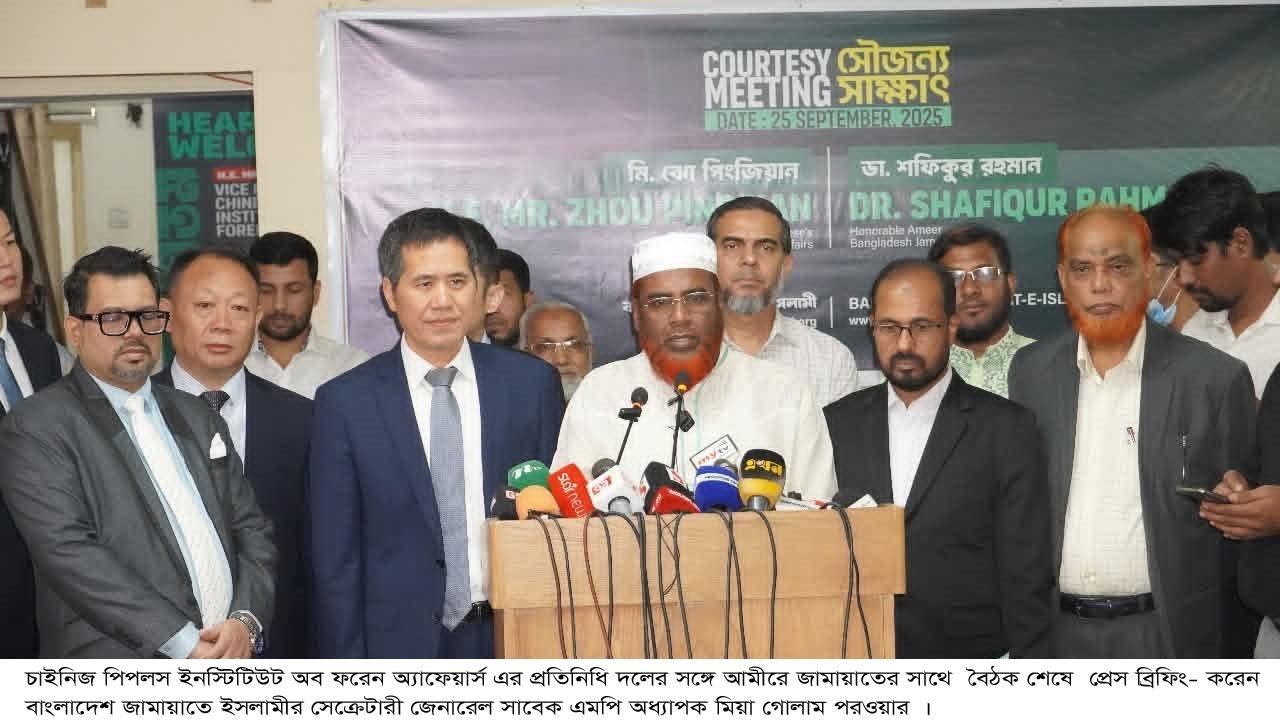 বাংলাদেশ জামায়াতে ইসলামীর কেন্দ্রীয় কার্যালয়ে ২৫ সেপ্টেম্বর বৃহস্পতিবার বেলা ১১টায় আমীরে জামায়াত ডা. শফিকুর রহমানের সঙ্গে চাইনিজ পিপলস ইনস্টিটিউট অব ফরেন অ্যাফেয়ার্স এর ভাইস প্রেসিডেন্ট রাষ্ট্রদূত মি. ঝৌ পিংজিয়ান এর নেতৃত্বে ৬ সদস্যের উচ্চপর্যায়ের এক প্রতিনিধি দল সৌজন্য বৈঠকে মিলিত হন। ভাইস প্রেসিডেন্ট মি. ঝৌ পিংজিয়ান এর সঙ্গে ছিলেন এশিয়া, আফ্রিকা ও লাতিন আমেরিকা বিষয়ক বিভাগের পরিচালক (সিপিআইএফএ) মি. ঝাও ইয়োংগুও, সাউথ এশিয়ান স্টাডিজ সেন্টার (পেকিং বিশ্ববিদ্যালয়) এর নির্বাহী উপপরিচালক ড. ওয়াং শু, এশিয়া, আফ্রিকা ও লাতিন আমেরিকা বিষয়ক বিভাগের কর্মকর্তা (সিপিআইএফএ) মিস ঝাং লি, চীনা দূতাবাসের পলিটিক্যাল ডিরেক্টর মি. ঝাং জিং এবং দূতাবাসের অ্যাটাশে মিস লিউ হোংরু।আমীরে জামায়াতের সঙ্গে ছিলেন জামায়াতের সেক্রেটারি জেনারেল সাবেক এমপি অধ্যাপক মিয়া গোলাম পরওয়ার, কেন্দ্রীয় নির্বাহী পরিষদ সদস্য এটিএম আজহারুল ইসলাম, , সহকারী সেক্রেটারি জেনারেল, কেন্দ্রীয় প্রচার ও মিডিয়া বিভাগের প্রধান এডভোকেট এহসানুল মাহবুব জুবায়ের, কেন্দ্রীয় নির্বাহী পরিষদ সদস্য, কেন্দ্রীয় প্রচার ও মিডিয়া বিভাগের সেক্রেটারি এডভোকেট মতিউর রহমান আকন্দ, কেন্দ্রীয় নির্বাহী পরিষদ সদস্য মোবারক হোসাইন এবং আমীরে জামায়াতের পররাষ্ট্র বিষয়ক উপদেষ্টা প্রফেসর ড. মাহমুদুল হাসান।বৈঠক শেষে এক সংক্ষিপ্ত প্রেস ব্রিফিং-এ অধ্যাপক মিয়া গোলাম পরওয়ার বলেন, আমরা অত্যন্ত সৌহার্দ্যপূর্ণ পরিবেশে সম্মানিত অতিথিবৃন্দকে স্বাগত জানিয়েছি। আমীরে জামায়াতের সঙ্গে তাদের সৌজন্য সাক্ষাৎ ও মতবিনিময় হয়েছে। সম্মানিত আমীরে জামায়াত অসুস্থ হওয়ার পর কিছুটা সুস্থ হয়ে এই প্রথম কেন্দ্রীয় অফিসে বিদেশি কোনো ডেলিগেশনের সামনে উপস্থিত হতে পেরে তিনি মহান আল্লাহর শুকরিয়া আদায় করেছেন এবং সম্মানিত অতিথিবৃন্দকে কৃতজ্ঞতা জানিয়েছেন। ৭৫-এর পর বাংলাদেশের সঙ্গে চায়নার কূটনৈতিক ও বন্ধুত্বসুলভ সম্পর্কের কথা স্মরণ করা হয়েছে। আমীরে জামায়াত চায়নার নেতৃবৃন্দকে বলেছেন, ‘চীন ও বাংলাদেশ পরস্পর উন্নয়ন সহযোগী। আমরা একত্রে উভয় দেশের কী কী উন্নয়ন করতে পারি এবং বন্ধুত্বের চেয়ে প্রতিবেশীর ঘনিষ্ঠ ব্রাদারলি রিলেশনকে আমরা গুরুত্বপূর্ণ মনে করি। অর্থনীতিসহ সামগ্রিক বিষয়ে আমরা বাংলাদেশ নিজেদের পায়ে দাঁড়াবার চেষ্টকরছি।’অধ্যাপক মিয়া গোলাম পরওয়ার বলেন, পতিত ফ্যাসিস্ট সরকারের আমলে জামায়াতে ইসলামী’র উপর অকথ্য জুলুম-অত্যাচার চালানো হয়েছে। আমাদের নেতৃবৃন্দকে কারাগারে হত্যা করা হয়েছে। আমাদের নিবন্ধন কেড়ে নেওয়া হয়েছে। আমাদের অফিসগুলো বন্ধ করে রাখা হয়েছিল। আমাদের 