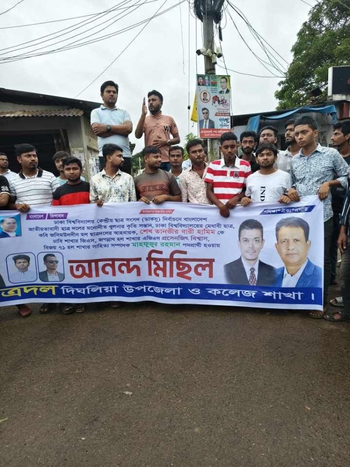 ঢাকা বিশ্ববিদ্যালয় কেন্দ্রীয় ছাত্র সংসদ (ডাকসু) নির্বাচনে বাংলাদেশ জাতীয়তাবাদী ছাত্র দলের মনোনীত খুলনার কৃতি সন্তান বাংলাদেশ জাতীয়তাবাদী দলের কেন্দ্রীয় তথ্য বিষয়ক সম্পাদক আজিজুল বারী হেলাল এর ভ্রাতুষ্পুত্র ঢাকা বিশ্ববিদ্যালয়ের মেধাবী ছাত্র, কবি জসিমউদদীন হল ছাত্রদলের আহবায়ক শেখ তানভীর বারী হামিম কে ঢাবি শাখার জিএস, জগন্নাথ হল শাখার প্রসেনজিৎ বিশ্বাসকে এজিএস ও বিজয় ৭১ হল শাখার ছাত্র মাহফুজুর রহমানকে সাহিত্য সম্পাদক পদে পদপ্রার্থী করায় দিঘলিয়া উপজেলা ছাত্রদল ও কলেজ শাখা ছাত্রদলের আনন্দ মিছিল অনুষ্ঠিত হয় বৃহস্পতিবার বিকাল ৫টায়। আনন্দ মিছিলে উপস্থিত ছিলেন দিঘলিয়া উপজেলা ছাত্রদলের আহবায়ক গাজী মনিরুল ইসলাম, সদস্য সচিব গাজী হিমেল হোসেন, সিনিয়র যুগ্ম আহবায়ক মেহেদী হাসান সাজ্জাদ, যুগ্ম আহবায়ক জাহিদুল ইসলাম রাজন, ওহিদুজ্জামান বেলাল, সোহেল রানা,অমিত কুমার, আবিদ আজাদ, আশরাফুল ইসলাম সাবু, আলহাজ্ব সারোয়ার খান কলেজ ছাত্রদলের সভাপতি সাকিব ইসলাম নয়ন, মজিদ কলেজ ছাত্রদলের সভাপতি রাকিব গাজী, সাধারণ সম্পাদক বাপ্পি শেখ, আমির হোসেন,ইমন, সালাউদ্দিন গাজী, রাহাত হোসেন,আলামিন,সবুজ গাজী,আরিফুল ইসলাম, সানজিদা,সাথী, রাহাদ, সৌরভ, লিটু,নয়ন,জিলান,হাসিবুল প্রমুখ।।