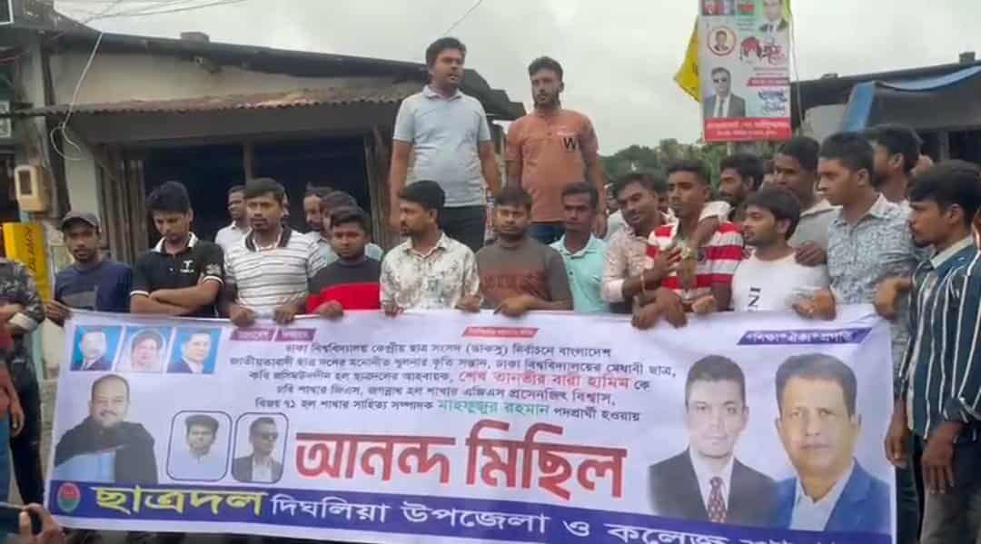ঢাকা বিশ্ববিদ্যালয় কেন্দ্রীয় ছাত্র সংসদ (ডাকসু) নির্বাচনে বাংলাদেশ জাতীয়তাবাদী ছাত্রদলের মনোনীত খুলনার কৃতি সন্তান বাংলাদেশ জাতীয়তাবাদী দলের কেন্দ্রীয় তথ্য বিষয়ক সম্পাদক আজিজুল বারী হেলাল এর ভ্রাতুষ্পুত্র ঢাকা বিশ্ববিদ্যালয়ের মেধাবী ছাত্র, কবি জসিমউদদীন হল ছাত্রদলের আহবায়ক শেখ তানভীর বারী হামিম কে ঢাবি শাখার জিএস, জগন্নাথ হল শাখার প্রসেনজিৎ বিশ্বাসকে এজিএস ও বিজয় ৭১ হল শাখার ছাত্র মাহফুজুর রহমানকে সাহিত্য সম্পাদক পদে পদপ্রার্থী করায় দিঘলিয়া উপজেলা ছাত্রদল ও কলেজ শাখা ছাত্রদলের পক্ষ থেকে বৃহস্পতিবার (২১আগষ্ট) বিকাল ৫টায় আনন্দ মিছিল অনুষ্ঠিত হয়।