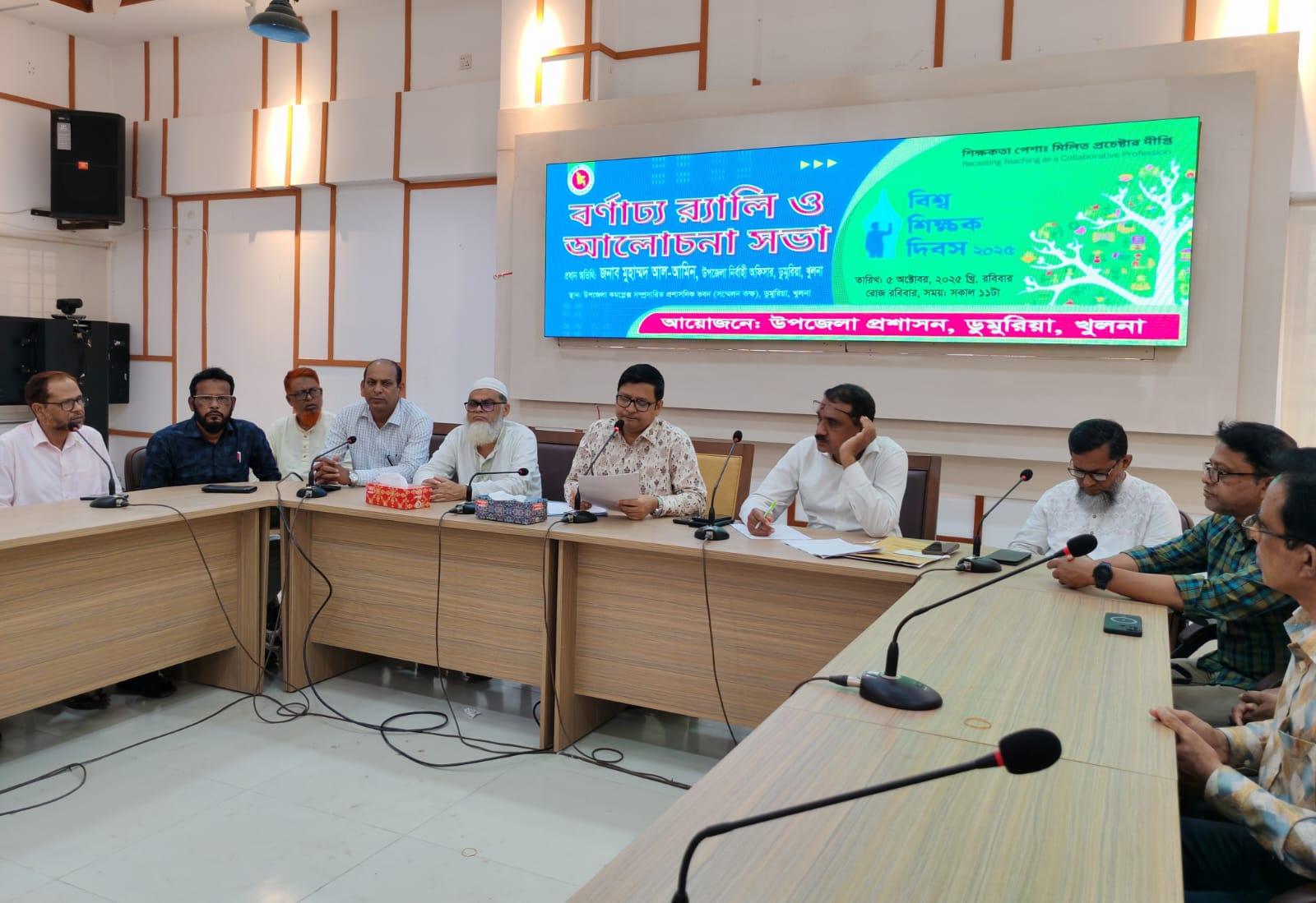 এ বছর দিবসটির প্রতিপাদ্য ‘শিক্ষকতা পেশা: মিলিত প্রচেষ্টার দীপ্তি’ এই স্লোগানকে সামনে রেখে রবিবার সকাল ১০টায় ডুমুরিয়া উপজেলা প্রশাসনিক ভবন দ্বিয়তলা সম্মেলন কক্ষে ডুমুরিয়া উপজেলা প্রশাসন, আয়োজনে আলোচনা সভা অনুষ্ঠিত হয়।