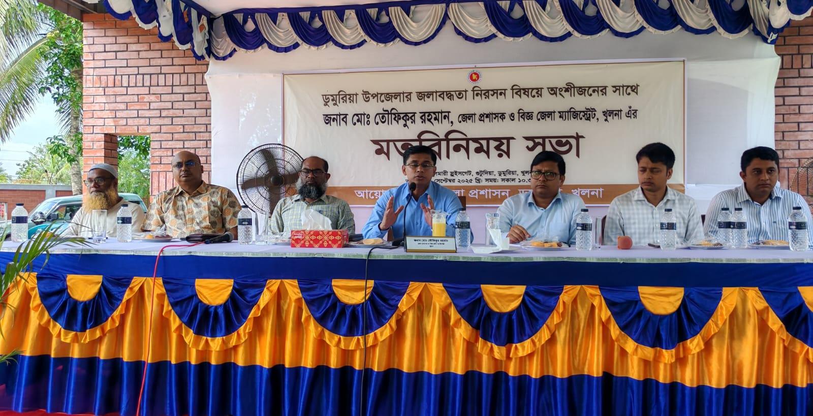 ডুমুরিয়া উপজেলা প্রশাসনের আয়োজনে শনিবার ১৩ সেপ্টেম্বর সকাল ১০টায় ডুমুরিয়া উপজেলা শৈলমারি সুইসগেট এলাকায় জলাবদ্ধতা নিরসনের দাবিতে মতবিনিময় সভা অনুষ্ঠিত হয় সভায় সভাপতিত্ব করেন ডুমুরিয়া উপজেলা নির্বাহী অফিসার মুহাম্মাদ আল আমিন, প্রধান অতিথি হিসেবে বক্তব্য দেন খুলনা নবাগত জেলা প্রশাসক মোঃ তৌফিকুর রহমান তিনি বলেন জলবায়ুর পরিবর্তন পরিবেশের বিরুপ প্রভাব। প্রবাহমান নদীর পানির সুষ্ঠু বন্টন,মানবসৃষ্ট নদী খাল দখল নানা কারনে এ জলাবদ্ধাতার সৃষ্টি। বিল ডাকাতিয়া প্রতিযোগিতার ডুমুরিয়াসহ উপজেলার বিভিন্ন পোল্ডারে বিল গুলো তলিয়ে স্থায়ী জলবদ্ধতা রুপ নিয়েছে। এর থেকে সকলকে মিলে মিশে কাজ করলে সমাধান মিলবে। সরকারের আন্তরিক দীর্ঘমেয়াদী পরিকল্পনার মাধ্যমে জলাবদ্ধতা নিরসন সম্ভব।এসময় বিশেষ অতিথি বক্তব্য দেন খুলনা পানি উন্নয়ন বোর্ডের তত্ত্বাবধায়ক প্রকৌশলী মোঃ আব্দুল মতিন, বি এ ডিসির নির্বাহী প্রকৌশলী মোঃ জামাল ফারুক,খুলনা পানি উন্নয়ন বোর্ডের নির্বাহী প্রকৌশলী উজ্জ্বল কুমার সেন, ডুমুরিয়া উপজেলা কৃষি অফিসার কৃষিবিদ মোঃ ইনসান ইবনে আমিন,বক্তব্য দেন ডুমুরিয়া থানার ওসি তদন্ত আছেক আলি, সাংবাদিক এস এম জাহাঙ্গীর আলম,জি এম আব্দুস সালাম, সুব্রত কুমার ফৌজদার, এম এ এরশাদ,সদর ইউনিয়নের চেয়ারম্যান গাজী হুমায়ূন কবির বুলু, চেয়ারম্যান সমারেশ