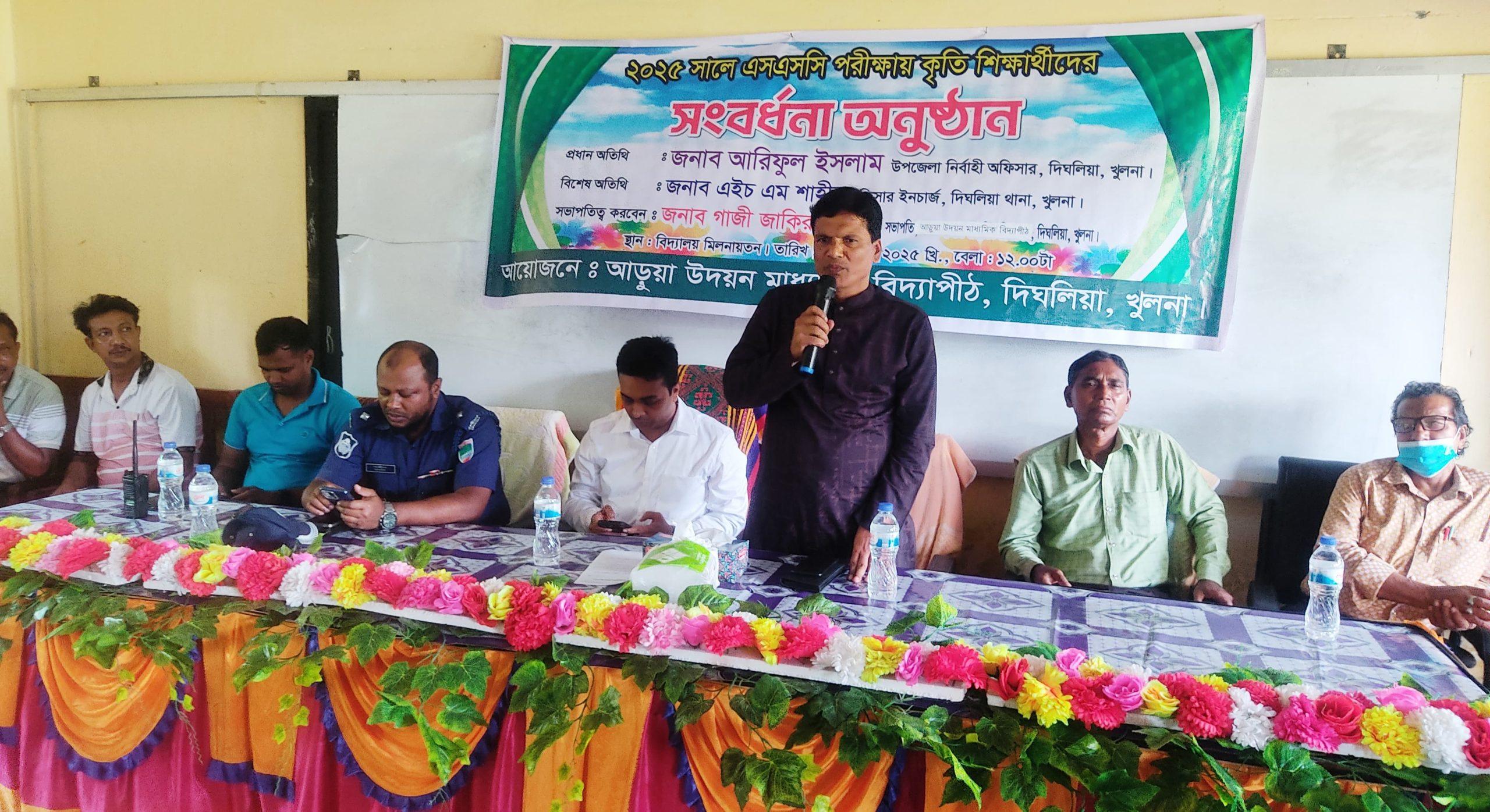 দিঘলিয়া উপজেলার বারাকপুর ইউনিয়নের আড়ুয়া উদয়ন মাধ্যমিক বিদ্যাপীঠে ২০২৫ এসএসসি পরীক্ষায় কৃতি শিক্ষার্থীদের সংবর্ধনা অনুষ্ঠান অনুষ্ঠিত হয়। গতকাল বৃহস্পতিবার (৪সেপ্টেম্বর) দুপুর ১২টায় অত্র বিদ্যালয়ের মিলনায়তনে আড়ুয়া উদয়ন মাধ্যমিক বিদ্যাপীঠের সভাপতি দিঘলিয়া উপজেলা বিএনপির যুগ্ম আহবায়ক গাজী জাকির হোসেন এর সভাপতিত্বে এবং সহকারী শিক্ষক হরিদাস মন্ডল এর সঞ্চালনায় অনুষ্ঠিত এ অনুষ্ঠানে প্রধান অতিথি হিসেবে উপস্থিত ছিলেন দিঘলিয়া