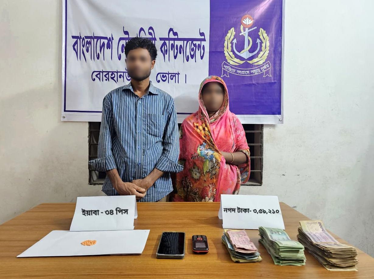 ভোলা, ১৩ সেপ্টেম্বর ২০২৫ঃ মাদক, সন্ত্রাস ও অপরাধমূলক কর্মকাণ্ড দমনে বাংলাদেশ নৌবাহিনী নিয়মিতভাবে দায়িত্বপ্রাপ্ত এলাকায় অভিযান পরিচালনা করে আসছে। এরই ধারাবাহিকতায় গতকাল শুক্রবার (১২-০৯-২০২৫) দিবাগত রাত নৌবাহিনী ও পুলিশ ভোলা জেলার বোরহানউদ্দিন উপজেলার কাচিয়া ইউনিয়নের ৮ নং ওয়ার্ডে অভিযান পরিচালনা করে। অভিযানে চকডুষ (চৌকিদার বাড়ি) এলাকার চিহ্নিত মাদক ব্যবসায়ী মোঃ শহীদ ও তার স্ত্রী তসলিমা-কে আটক করা হয়। এ সময় তল্লাশি চালিয়ে তাদের কাছে থেকে ইয়াবা, মোবাইল ফোন ০২ টি এবং মাদক ব্যবসায় ব্যবহৃত নগদ ৩ লক্ষ ৫৯ হাজার, ২শত ১০ টাকা জব্দ করা হয়।