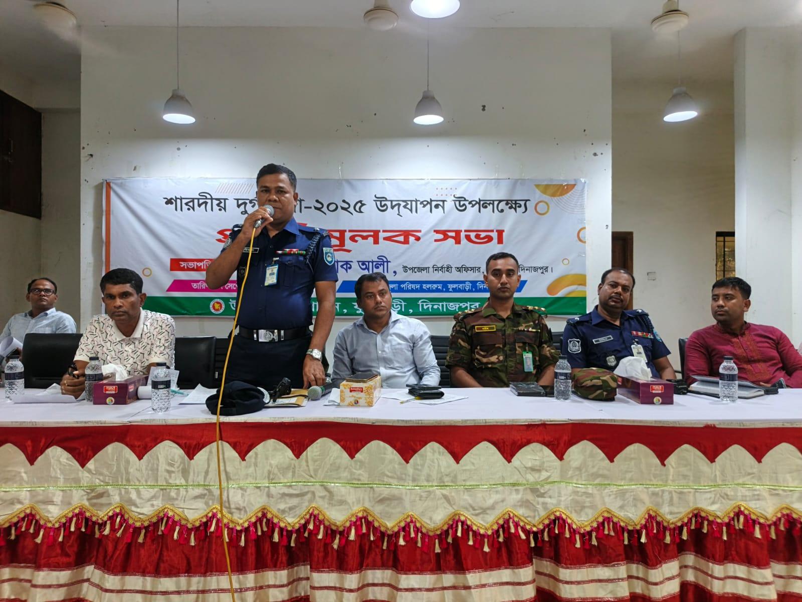 আজ বুধবার সকাল ১১ টায় ফুলবাড়ী উপজেলা পরিষদ হলরুমে প্রস্তুতি সভায় উপজেলা নির্বাহী অফিসার মো. ইসাহাক আলীর সভাপতিত্বে বিশেষ অতিথি হিসেবে উপস্থিত থেকে বক্তব্য রাখেন,ফুলবাড়ী থানার অফিসার ইনচার্জ একেএম খন্দকার মহিব্বুল, সেনাবাহিনীর কর্মকর্তা ক্যাপ্টেন কাজি নাইম হোসেন, উপজেলা আনসার ও ভিডিপি কর্মকর্তা রীতা গুপ্তা, প্রকল্প বাস্তবায়ন কর্মকর্তা মিজানুর রহমান,উপজেলা পুজা উদযাপন কমিটির আহবায়ক আনন্দ কুমার গুপ্ত, সাধারণ সম্পাদক রতন চক্রবর্তী। এ সময় অন্যান্যদের মধ্যে বক্তব্য রাখেন জামায়াতের আমির মাওলানা হাবিবুর রহমান,