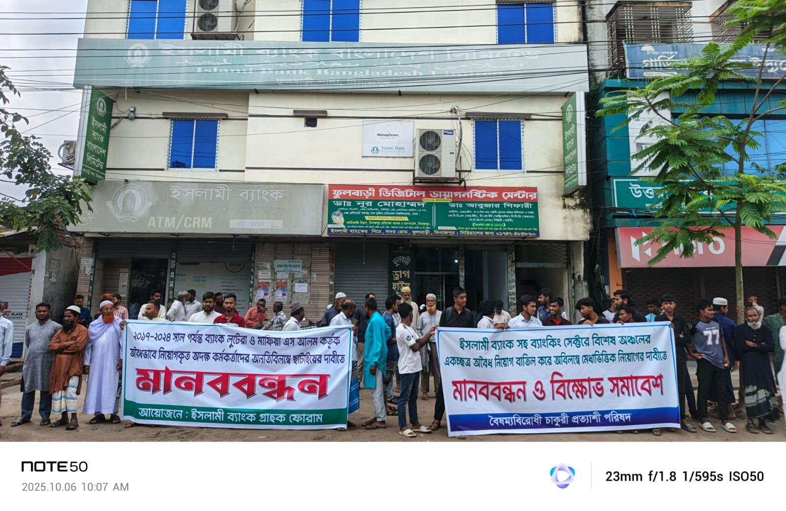 ৬ অক্টোবর (সোমবার) সকাল ১০ টা থেকে ১১ পর্যন্ত এক ঘন্টাব্যাপী ফুলবাড়ী ইসলামী ব্যাংকের সামনে মানববন্ধন করেছে ইসলামী ব্যাংক গ্রাহক ফোরাম ও বৈষম্য বিরোধী চাকরি প্রত্যাশী পরিশোধ ব্যানারে।