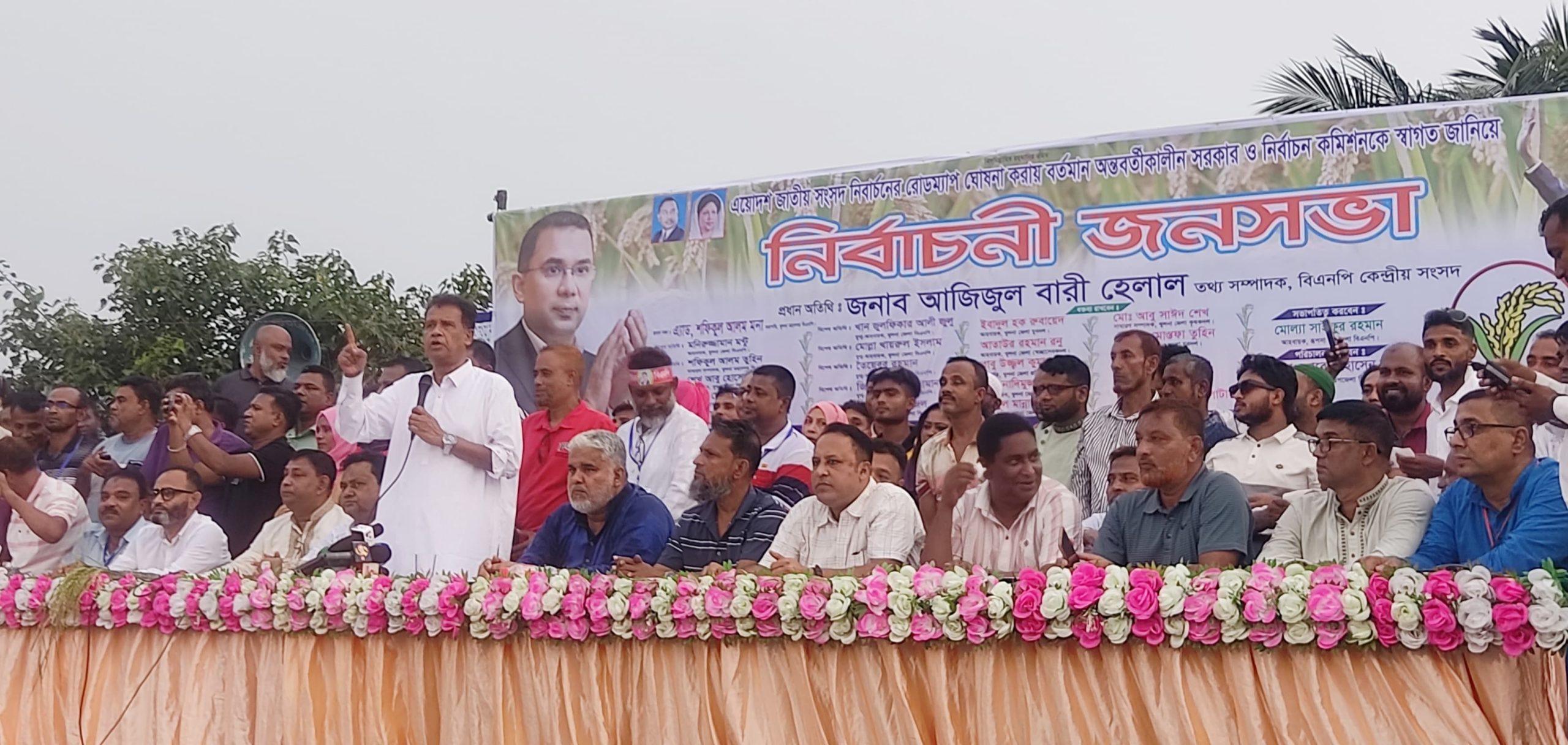 বাংলাদেশ জাতীয়তাবাদ দলের কেন্দ্রীয় তথ্য বিষয়ক সম্পাদক আজিজুল বারী হেলাল বলেন, বিএনপি জনগণের দল জনসম্প্রীতির দল। জনগণের আশা আকাঙ্ক্ষা পূরণই বিএনপির মূল্য লক্ষ্য। তিনি জামায়াতের উদ্দেশ্যে বলেন, আজকে যারা সংষ্কার সংষ্কারের কথা বলেন তারা বিগত দিনে আপনারা কি সংষ্কার চেয়েছেন। আমরা তো ২০০৮ সাল ফখরুদ্দিন মঈনউদ্দীন এর আমল থেকেই রাষ্ট্রের সংষ্কারের কথা বলে এসেছি এবং জুলাই আগষ্ট ছাত্রজনতার গণ-অভ্যুত্থানের পর ৩১দফা সংষ্কারের কথা জনসম্মুখে তুলে ধরেছি। আপনারা এখন পিআর পদ্ধতিতে নির্বাচনের কথা বলেন এর কারণ কিন্তু আমরা জানি। এর কারণ হলো আপনারা এখনও জনসম্পৃক্ত নন। তিনি আরও বলেন, বাংলাদেশে গনতন্ত্রের একমাত্র রক্ষাকবচ হচ্ছে বিএনপি। বিএনপিই একমাত্র দল যারা বাংলাদেশের স্বাধীনতা ও সার্বভৌমত্ব রক্ষায় দৃঢ়প্রতিজ্ঞ। অল্প ক'দিন পরেই সনাতনী ধর্মাবলম্বীদের সবচেয়ে বড় ধর্মীয় উৎসব শারদীয় দুর্গাপূজা। আমাদেরকে কাধে কাধ মিলিয়ে এ উৎসবকে সাফল্য মণ্ডিত করতে হবে। রবিবার(২১ সেপ্টেম্বর) বিকাল ৪টায় রূপসা বাসস্ট্যান্ডে রূপসা উপজেলা বিএনপির আয়োজনে ত্রয়োদশ জাতীয় সংসদ নির্বাচনের রোডম্যাপ ঘোষণা করায় বর্তমান অন্তর্বর্তীকালীন সরকার ও নির্বাচন কমিশনকে স্বাগত জানিয়ে নির্বাচনী জনসভায় প্রধান অতিথির বক্তব্যে এসব কথা বলেন তিনি। রূপসা উপজেলা বিএনপির আহবায়ক মোল্যা সাইফুর রহমানের সভাপতিত্বে এবং সদস্য সচিব মোঃ জাবেদ হোসেন মল্লিকের সঞ্চালনায় নির্বাচনী জনসভায় বিশেষ অতিথি হিসেবে উপস্থিত ছিলেন খুলনা জেলা বিএনপির আহবায়ক মনিরুজ্জামান মন্টু, খুলনা মহানগর বিএনপির সাধারণ সম্পাদক শফিকুল আলম তুহিন, জেলা বিএনপির সিনিয়র যুগ্ম আহবায়ক এ্যাড. মোমরেজুল ইসলাম, যুগ্ম আহবায়ক শেখ আবু হোসেন বাবু, সাবেক সদস্য সচিব এস এম মনিরুল হাসান বাপ্পী, যুগ্ম আহবায়ক খান জুলফিকার আলী জুলু, মোল্লা খায়রুল ইসলাম, তৈয়েবুর রহমান, জি. এম কামরুজ্জামান টুকু, এনামুল হক সজল। নির্বাচনী জনসভায় আরও উপস্থিত ছিলেন খুলনা জেলা যুবদলের আহবায়ক ইবাদুল হক রুবায়েদ, যুগ্ম আহবায়ক গোলাম মোস্তফা তুহিন, স্বেচ্ছাসেবক দলের আহবায়ক আতাউর রহমান রুনু, জেলা মহিলা দলের সদস্য সচিব সেতারা সুলতানা, সিনিয়র সহ সভাপতি শাহানাজ ইসলাম, দিঘলিয়া উপজেলা ছাত্রদলের আহবায়ক গাজী মনিরুল ইসলাম, সদস্য সচিব গাজী হিমেল হোসেন, সিনিয়র যুগ্ম আহবায়ক মোঃ মেহেদি হাসান সাজ্জাদ, যুবদল নেতা গাজী বাবু প্রমুখ।।