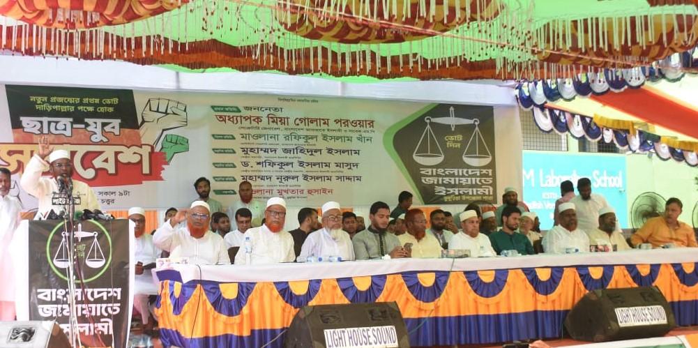 বাংলাদেশ জামায়াতে ইসলামীর সেক্রেটারি জেনারেল ও সাবেক এমপি অধ্যাপক মিয়া গোলাম পরওয়ার বলেছেন, মানব রচিত আইন নয়, দুর্নীতি, চুরি, ধর্ষণ, খুন বন্ধে প্রয়োজন আল-কুরআনের শাসন। তাই আগামী নির্বাচনে ইসলামের পক্ষের শক্তিকে বিজয়ী করে তিনি একটি কল্যানমুখী রাষ্ট্রে পরিণত করতে ‘তরুণ প্রজন্মের প্রথম ভোট, দাড়িপাল্লার পক্ষে হোক’ এ শ্লোগান নিয়ে সামনে এগিয়ে আসার আহবান জানান। মিয়া গোলাম পরওয়ার আরও বলেন, “আগামী নির্বাচনে খুনী, চাঁদাবাজ ও মাস্তানদের সঙ্গে তরুণ ভোটারদের লড়াই হবে। সুতরাং যারা ফ্যাসিবাদকে বিদায় দিয়েছে সেই তরুণ প্রজন্মই আগামীতেও দেশ পরিচালনায় সঠিক নেতৃত্ব বেছে নেবে।” শুক্রবার (২৬ সেপ্টেম্বর) সকালে খুলনা জেলার ডুমুরিয়া উপজেলা জামায়াতে ইসলামীর উদ্যোগে ডুমুরিয়া স্বাধীনতা চত্বরে এবং বিকেলে ফুলতলা উপজেলা জামায়াতের উদ্যোগে ফুলতলা স্বাধীনতা চত্বরে পৃথক দু’টি ছাত্র-যুব সমাবেশে প্রধান অতিথির বক্তব্যে তিনি এসব কথা বলেন।অধ্যাপক মিয়া গোলাম পরওয়ার বলেন, জামায়াত দেশ পরিচালনার সুযোগ পেলে বেকার সমস্যার সমাধান, শিক্ষার আমূল সংস্কার এবং কারিগরি দক্ষতাভিত্তিক সমাজ গড়ে একটি সুখী-সমৃদ্ধ ও মানবিক বাংলাদেশ গঠন করবে। ডুমুরিয়া-ফুলতলার দীর্ঘদিনের জলাবদ্ধতার মূল কারণ বিল ডাকাতিয়াকে কেন্দ্র করে মহাপরিকল্পনা গ্রহণের ঘোষণা দিয়ে তিনি বলেন, “ডুমুরিয়াকে ব্যবসায়িক হাবে রূপান্তর করা হবে। শিক্ষা শেষে চাকরি নিশ্চিত করা হবে, না হলে বেকার ভাতা দেওয়া হবে।”তিনি জামায়াতের আমীর ডা. শফিকুর রহমানের উদ্বৃতি দিয়ে বলেন, ‘আমীরে জামায়াত ঘোষণা দিয়েছেন, জামায়াত রাষ্ট্র পরিচালনার দায়িত্ব পেলে কোন নেতা সরকারি গাড়ি, বাড়ি, প্লট নেবেনা। সৎ সাহস থাকলে অন্য কোন দলের নেতারা এমন ঘোষণা দিক। সে সাহস অন্য দলের নেতাদের নেই। সুতরাং জামায়াতই একমাত্র মানবিক বাংলাদেশ গড়তে পারবে ইনশাআল্লাহ।’