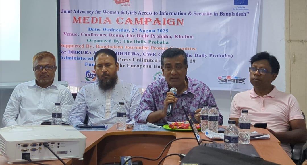 ফ্রি প্রেস আনলিমিটেড, আর্টিকেল ১৯ এবং ইউরোপীয় ইউনিয়নের অর্থায়নে বাংলাদেশ জার্নালিস্ট প্রটেক্ট কমিটি (বিজেপিসি)-এর সার্বিক সহযোগিতায় খুলনায় মিডিয়া ক্যাম্পেইন অনুষ্ঠিত হয়েছে।বুধবার সকাল ১০টা থেকে দুপুর ২টা পর্যন্ত দৈনিক প্রবাহের কনফারেন্স রুমে মিডিয়া ক্যাম্পেইন অনুষ্ঠিত হয়।