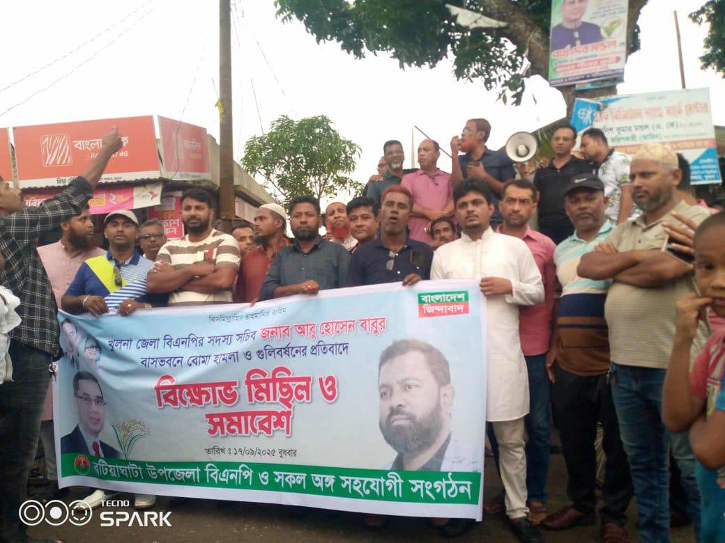 খুলনা জেলা বিএনপির সদস্য সচিব আবু হোসেন বাবুর বাসভবনে বোমা হামলা ও গুলিবর্ষনের প্রতিবাদে গতকাল ২৭ সেপ্টেম্বর বিকাল ৫টায় বটিয়াঘাটা বিএনপির উদ্দ্যোগে বিক্ষোভ মিছিল ও সমাবেশ অনুষ্ঠিতহয় । উপজেলা বিএনপির আহবায়ক এজাজুর রহমান শামীম'র সভাপতিত্বে ও সদস্য সচিব খন্দকার ফারুক হোসেন'র সঞ্চালনায় অনুষ্ঠিত বিক্ষোভ মিছিল