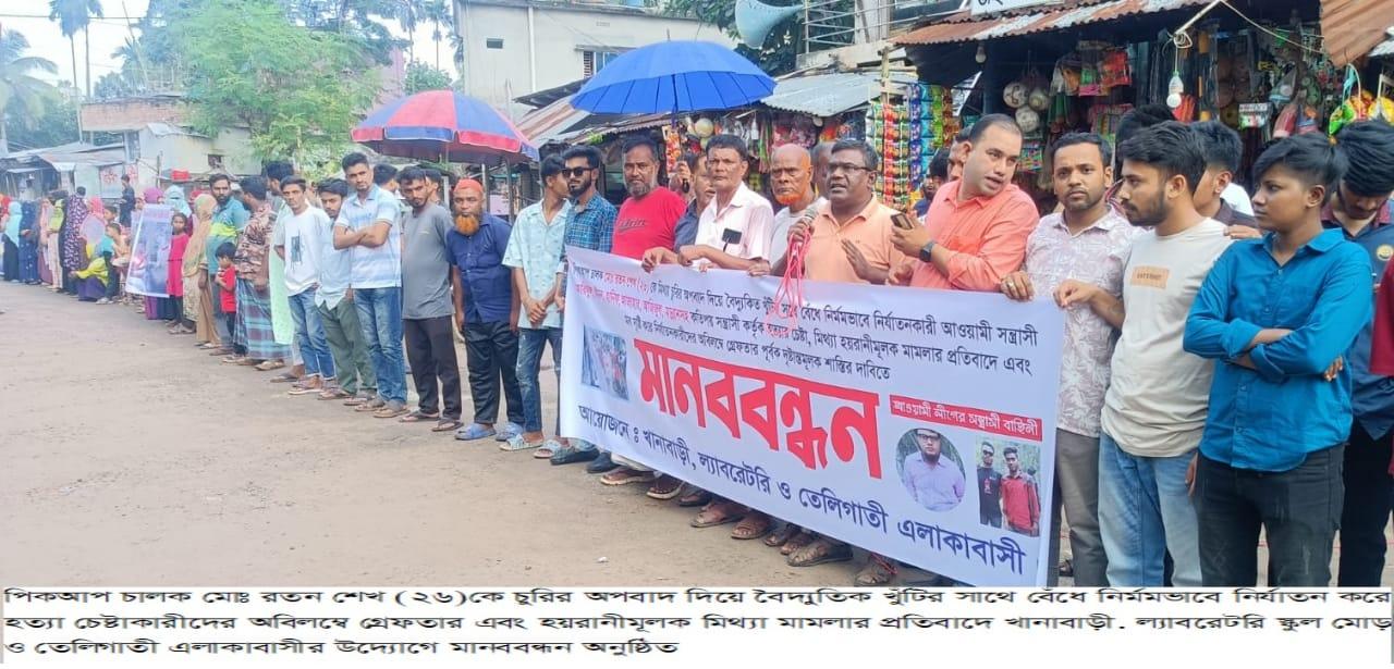 রতনকে মিথ্যা চুরির অপবাদ দিয়ে বৈদ্যুতিক খুঁটির সাথে বেঁধে নির্মমভাবে নির্যাতনের প্রতিবাদে মানববন্ধন