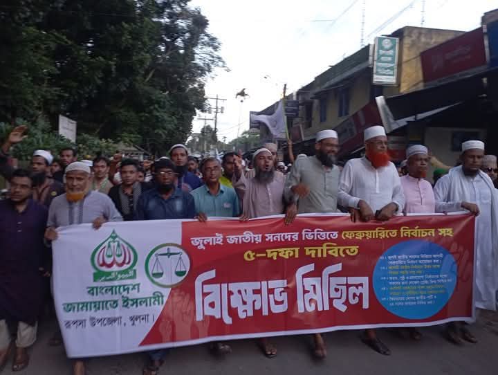 আগামী ফেব্রুয়ারিতে জুলাই সনদের ভিত্তিতে জাতীয় নির্বাচন অনুষ্ঠানসহ ৫ দফা দাবিতে রূপসায় বিক্ষোভ মিছিল ও সমাবেশ করেছে বাংলাদেশ জামায়াতে ইসলামী রূপসা উপজেলা শাখা।
