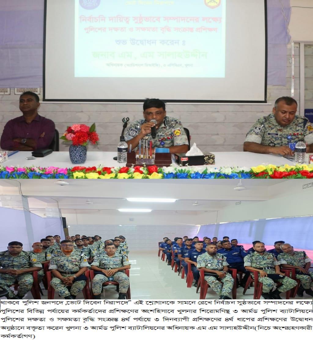 ‘‘থাকবে পুলিশ জনপদে,ভোট দিবেন নিরাপদে’’ এই শ্লোগানকে সামনে রেখে নির্বাচন সুষ্ঠভাবে সম্পাদনের লক্ষ্যে পুলিশের বিভিন্ন পর্যায়ের কর্মকর্তাদের প্রশিক্ষণের মাধ্যমে সকল প্রকার প্রভাবমুক্ত থেকে আইন শৃংখলা রক্ষায় সর্বোচ্চ পেশাদারিত্বে অবাধ, সুষ্ঠ ও নিরপেক্ষ নির্বাচন আয়োজনে বাংলাদেশ পুলিশের দেড় লক্ষ সদস্যকে নির্বাচনী প্রশিক্ষণের ব্যবস্থা গ্রহণ করা হয়েছে। এরই ধারাবাহিকতায় খুলনার শিরোমণিস্থ ৩ আর্মড পুলিশ ব্যাটালিয়নে পুলিশের দক্ষতা ও সক্ষমতা বৃদ্ধি সংক্রান্ত ৪র্থ পর্যায়ে ৩ দিনব্যাপী প্রশিক্ষণের ৪র্থ ধাপের প্রশিক্ষণের শুভ উদ্বোধন অনুষ্ঠিত হয়েছে। ১১ অক্টোবর শনিবার সকাল ৯টায় এ প্রশিক্ষণ কার্যক্রমের শুভ উদ্বোধন করেন খুলনা ৩ আর্মড পুলিশ ব্যাটালিয়নের অধিনায়ক( অ্যাডিশনাল ডিআইজি) এম এম সালাহউদ্দীন। উদ্বোধন অনুষ্ঠানে প্রশিক্ষণার্থী পুলিশ কর্তকর্তাদের উদ্দেশ্যে তিনি বলেন,‘‘ নির্বাচন সুষ্ঠভাবে সম্পাদনের লক্ষ্যে পুলিশের বিভিন্ন পর্যায়ের কর্মকর্তাদের প্রশিক্ষণের ব্যবস্থা করা হয়েছে। নির্বাচনে সকল প্রকার প্রভাবমুক্ত থেকে আইন শৃংখলা রক্ষার মাধ্যমে সর্বোচ্চ পেশাদারিত্বের মাধ্যমে একটি অবাধ, সুষ্ঠ ও নিরপেক্ষ নির্বাচনের আয়োজন করাই হবে পুলিশের প্রধান কাজ। এ লক্ষে নির্বাচনের দায়িত্ব পালনের সাথে জড়িত সকল পুলিশকে তাদের দায়িত্ব ও কর্তব্য এবং বডি-ওর্ন ক্যামেরার ব্যাবহারে প্রশিক্ষণ দেওয়া হচ্ছে।’’ এ সময় উপস্থিত ছিলেন খুলনা ৩ আর্মড পুলিশ ব্যাটালিয়নের সহ- অধিনায়ক পুলিশ সুপার জিএম আবুল কালাম আজাদ (পিপিএম), অ্যাডিশনাল এসপি মোঃ মাহবুবুর রহমানসহ অত্র ব্যাটালিয়নের সকল অফিসারবৃন্দ।