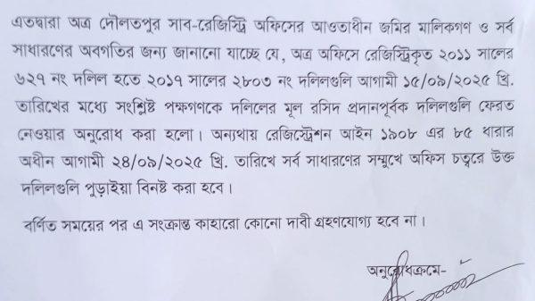 মহিদুল ইসলাম (শাহীন) খুলনা বাংলার চেতনা নিউজ। খুলনা মহানগরীর দৌলতপুর সাব-রেজিস্ট্রি অফিসের সাব রেজিস্ট্রার এন এম তানভীর ইমন স্বাক্ষরিত এক বার্তা গত ১৯ আগস্ট ২০২৫ প্রেরন করেন। একটা বিশেষ